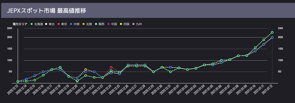 2020年12月後半から2021年1月にかけて、電力の卸売価格が高騰しました。