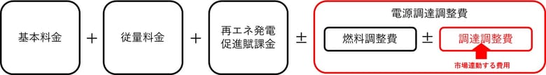 市場価格と連動して単価が決まる電気料金プラン以外にも、電源の調達にかかる費用の一部として「電源調達調整費」などが電気料金に含まれるプランもあります。これらのプランについては市場連動型プランと説明がされていない場合もありますが、市場価格の影響を一部受ける電気料金プランのため、広義の市場連動型プランといえるでしょう。
